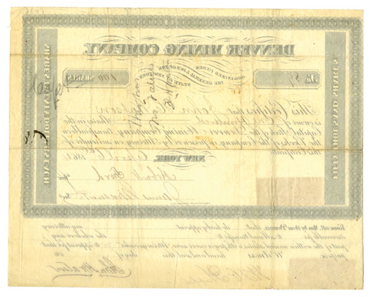 Colorado Territory...., New York, 1864. 100 Shares, I/U Capital Stock Certificate, Black print with black border, Company title at top without vignette, Two 25 Cents revenue stamps at left side, S/N 89; signed by Hobart Ford, President, and James Wadsworth, Secretary, the company controlled 400 feet on the Forks Lode in Nevada Gulch, Colorado, and the property was sold by the sheriff in 1866, VF to XF condition, Hatch & Co., James Hobart Ford served as a Union Army colonel (brevet brigadier general) during the American Civil War and played a significant role in the Trans-Mississippi Theater, including the Battle of Glorieta Pass and commanding the 2nd Colorado Cavalry Regiment. Rare and early Colorado mining stock certificate.