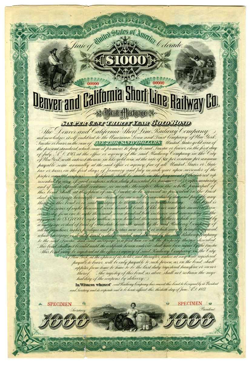 Colorado, 1883. $1000 Specimen 6% First Mortgage Thirty year Gold Coupon Bond, Black print with green border and underprint, Multiple vignette at top over company title and at bottom, VF to XF condition with archival repairs. ABNC.