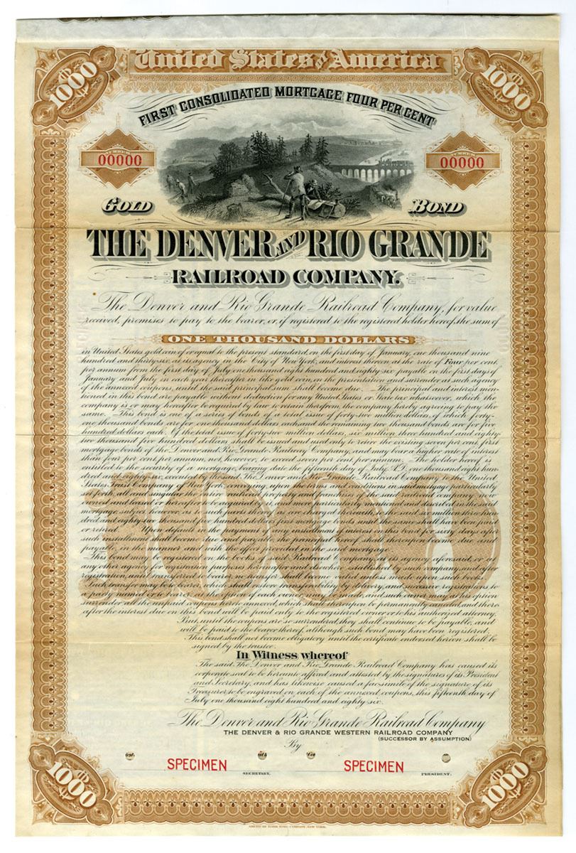 Colorado, 1886. $1000 Specimen 4% First Consolidate Mortgage Coupon Bond, Black print with brown border and underprint, Surveyors at top of mountain with train in distance above title at top center, Specimen overprints and POCs, XF to AU condition. ABNC.