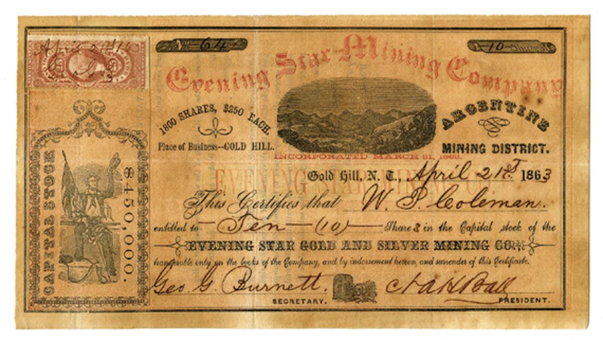 Colorado Territory.... (Offices and Incorporated in Gold Hill, Nevada Territory), April 21, 1863, Evening Star Gold and Silver Mining Company, 10 Shares at $250 each, I/U stock certificate, printed in black and red on light tan paper, with ornate left border enclosing vignette of what appears to be a seated Abraham Lincoln with shield, central vignette of a mountainous mining landscape, S/N 64, a red 25¢ adhesive revenue stamp (a Bond, 25 cents, Part Perforated stamp) affixed at upper left; Mines located in the Argentine Mining District, Colorado Territory, the company was located in Gold Hill, Nevada Territory, but the mine was in Colorado, signed by the company president and secretary; VF to Choice VF condition or better. This is one of the earliest Colorado Territory certificates we have offered. It appears that 1861 is probably the earliest date of a Colorado certificate known, but this certificate from 1863 was issued only 2 years after that. The Lincoln vignette is rare and evidently was utilized to show the patriotic support of the north in the Civil War.