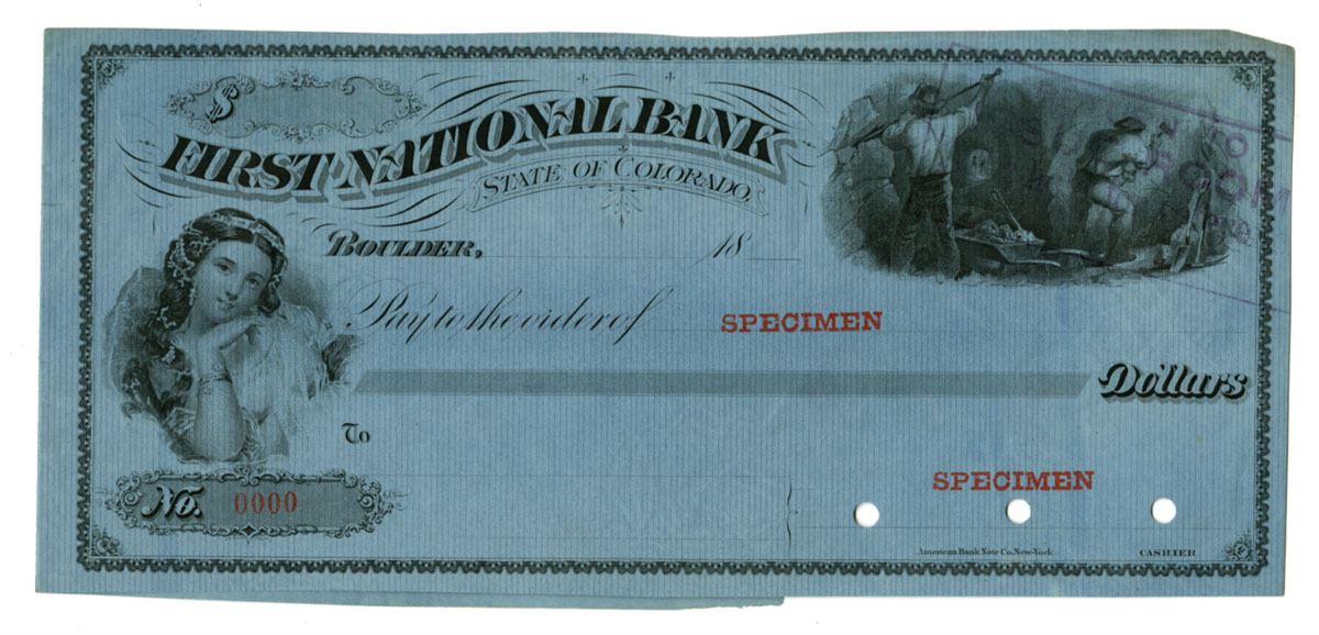 Boulder, Colorado, ND (1850-90s). Specimen Check with Black print on blue paper, Company title at top left corner with vignette of sailors at right and young woman at left, Specimen overprints and POCs, VF to XF condition with toning at edges. ABNC.