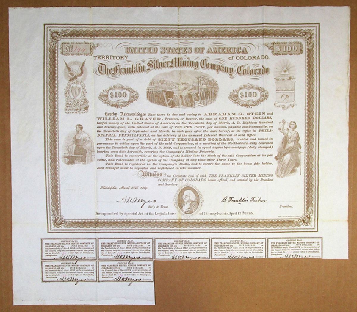 Colorado Territory, 1869. $100 I/U 10% Coupon Bond, Brown text with brown border, S/N 192, Signed by B. Franklin Fisher as company president. Mining scene depicted at top center, Eagle with American shield at top left, Man with anvil at bottom left, Seal of Colorado at top right, Allegorical Justice at bottom right, Ben Franklin at center bottom, and embossed company seal at bottom left. VF condition with pronounced fold lines, but in great condition for its age. Benjamin Franklin Fisher (1834-1915) enlisted in the Civil War in 1861, serving in the 32nd Pennsylvania Volunteers. In August, 1861, Fisher’s regiment arrived in Washington by train, and soon after he was detailed to the Signal Camp of Instruction, to assist Major Albert Myer in creating the Signal Corps. Generally, a signal officer’s mission was to produce intelligence reports. While shadowing Confederate columns near Aldie, Virginia, Fisher was captured and sent to Libby Prison. On February 9th, 1864, 109 prisoners tunneled out of Libby Prison, with Fisher leading the second party of ten. He eventually found his way back to Union Lines at Williamsburg, and eventually earned the rank of Brigadier General, resigning in 1866. After the war Fisher practiced law in Philadelphia and was active in many financial ventures, including mining. Historic bond signed by a notable figure in the Civil War.