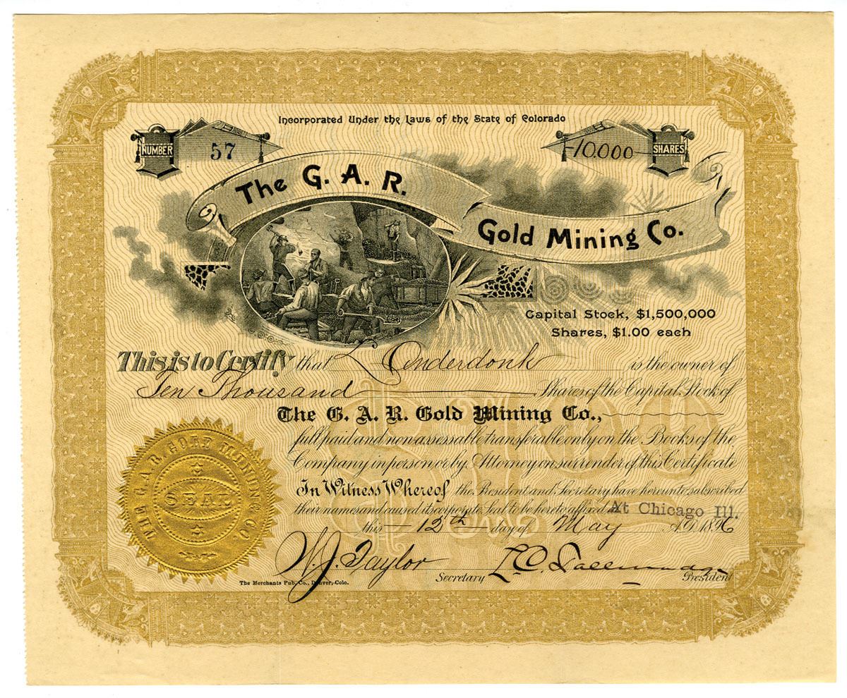 Colorado. 1,000 Shares Capital Stock I/U Certificate, Black print on gold border and under tint, Men working at mine at top below company title, VF-XF condition, Merchants Pub. Co.
