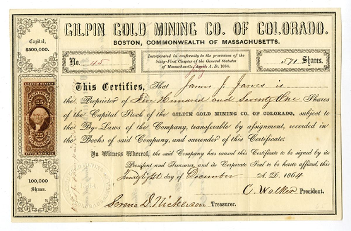 Colorado Territory (Inc. and Offices in Boston, Massachusetts offices), 1864, 77 Shares I/U stock certificate, black print on white paper with decorative border, embossed company seal at lower left, issued December 24, 1864. Revenue stamp affixed at left. The Gilpin Gold Mining Co. of Colorado was incorporated under the laws of Massachusetts in 1864. The company operated during the early development of the Gilpin County gold fields, one of the richest and most famous gold-producing regions in Colorado, centered on Central City and Black Hawk. Historic and early piece reflecting East Coast capital investment in Colorado mining ventures. VF condition.