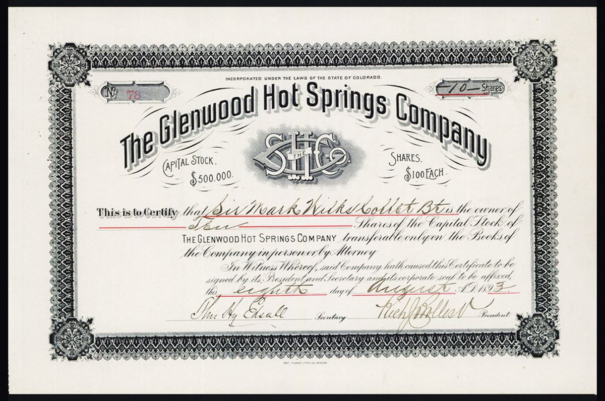 Colorado, 1893, 10 Shares, Issued and Uncancelled Stock, #78, Black on black border and underprint, Company logo mid-center with ornate border on the margins, Issued by The Glenwood Hot Springs Company, formed in the early 1890s to develop and operate the natural mineral hot springs at Glenwood Springs, Colorado, among the largest geothermal spring systems in North America. Long valued for their reputed healing properties, the springs gained national prominence after the arrival of the Denver & Rio Grande Railroad, which made the Colorado River valley accessible to health and leisure travelers. By the early 1890s, Glenwood Springs had become a leading Western spa destination, and the company’s incorporation marked the transition from small-scale bathhouses to a capitalized resort enterprise modeled after major American and European health resorts. Financial backing typically came from local and regional investors with ties to real estate, railroads, and tourism, reflecting confidence in the long-term growth of Western resort development despite the economic disruption of the Panic of 1893., VF-XF condition, Pioneer Lithography Co.
