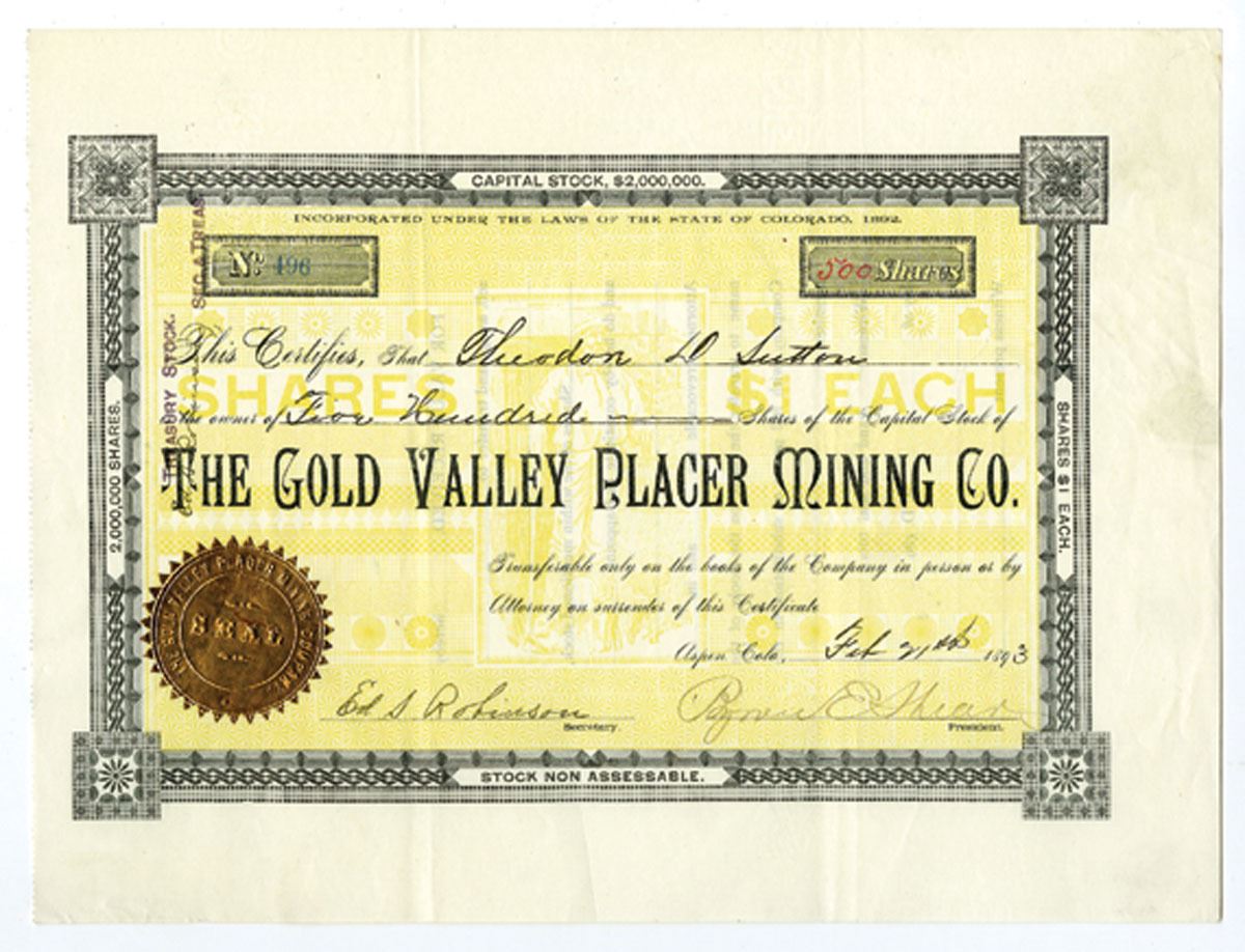 Aspen, Colorado....... (Inc. in Colorado, offices in Aspen, Colorado), issued February 21, 1893, for 500 shares to Theodor D. Sutton. Capital stock $2,000,000 divided into 2,000,000 shares at $1 each. Attractive certificate printed in yellow and black with bold type and patterned background, featuring an embossed gold corporate seal at lower left. The term Placer Mining refers to the extraction of gold from alluvial deposits, often using water and gravity separation, a common method during Colorado’s late-19th century mining surge. Incorporated under the laws of Colorado in 1892, the Gold Valley Placer Mining Co. reflects the speculative rush into placer claims in the Roaring Fork and Aspen districts, even as the national economy approached the Panic of 1893. Signed by Ed. S. Robinson, Secretary, and George H. Allen, President. Bright and visually engaging example. Choice to XF-XF condition.