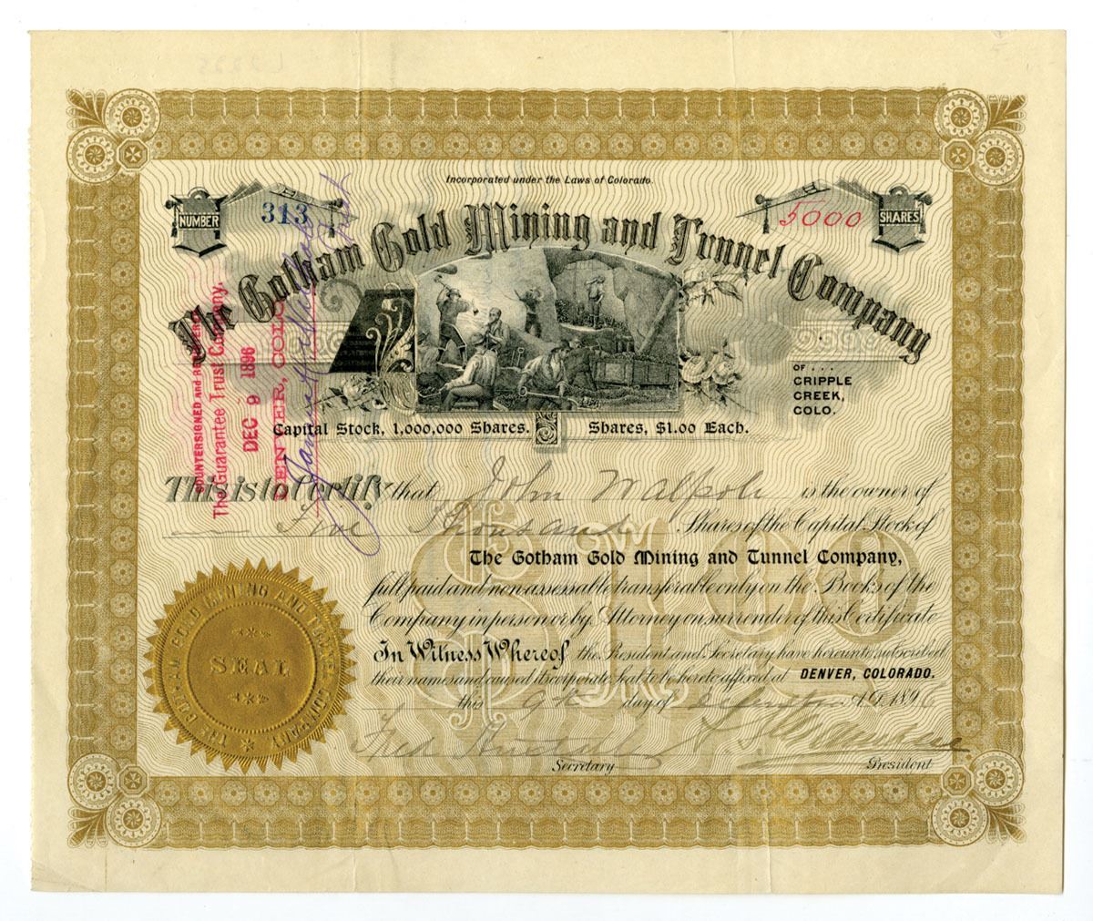 Denver, Colorado, 1896. 5000 Shares Capital Stock I/U Certificate, Black print with gold border and underprint, Mining vignette under title at top center with gold embossed seal at bottom left, S/N 313, VF to XF condition.