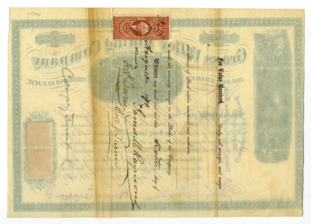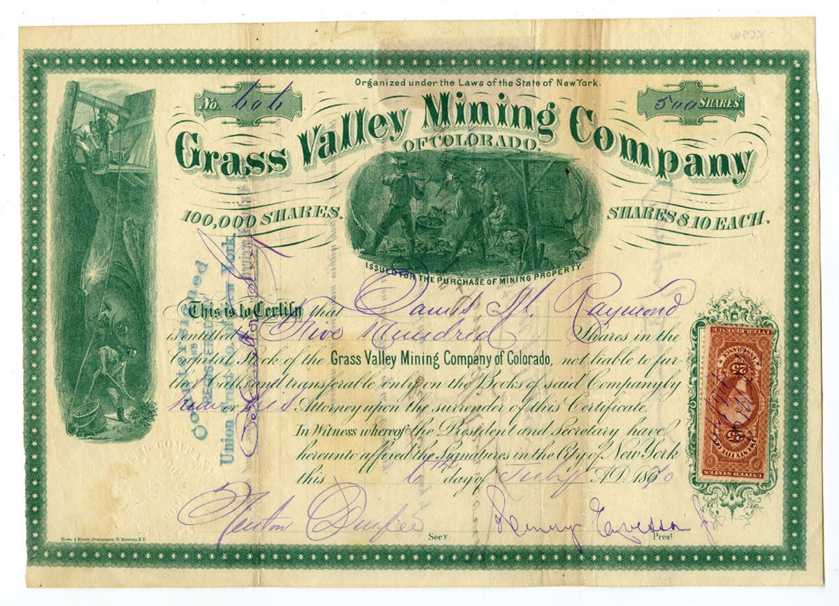 Colorado Territory (Offices & Inc. in New York, NY), 500 Shares I/U stock certificate, green print on white paper with star-pattern border, three vignettes including miners working underground at left, an active mining scene at center, and allegorical figures at right, 25¢ U.S. revenue stamp at lower right, signed by the company president and secretary, the Grass Valley Mining Company was incorporated in New York to develop mining properties in Colorado during the 1860s gold boom, Choice Fine to VF condition or better, Printed by Hosford & Sons, Stationers, New York.