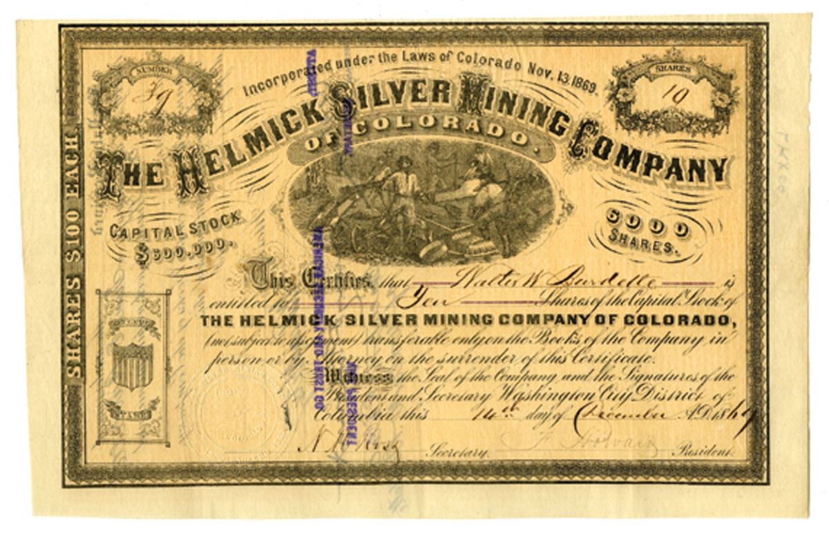 Colorado Territory (Inc. in Colorado, offices in Washington, D.C.), 1869, 10 Shares I/U stock certificate, black print on white paper, ornate border, central vignette of miners working underground with pick and wheelbarrow, embossed company seal at lower left, issued December 14, 1869. S/N 39, The Helmick Silver Mining Company was incorporated under the laws of Colorado in November 1869 with $300,000 capital stock divided into $100 shares. Early post–Civil War era mining venture, reflecting the rush for Colorado’s silver lodes during the formative years of organized mining investment in the territory. Choice VF condition or better.