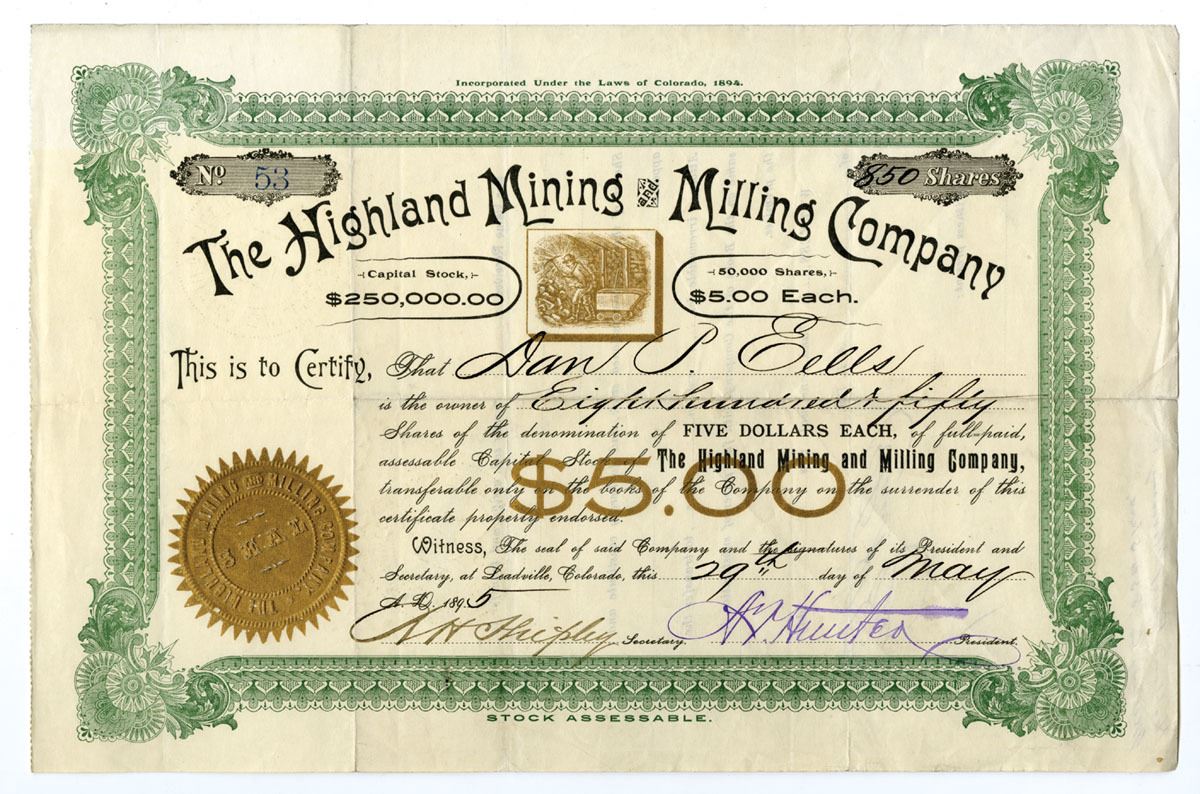 Leadville, Colorado, 1895. 850 Shares Capital Stock I/U Certificate, Black print with green border and gold underprint, Company title at top center with small square vignette of mining scene and gold seal at bottom right, S/N 53, Fine to VF+ condition.