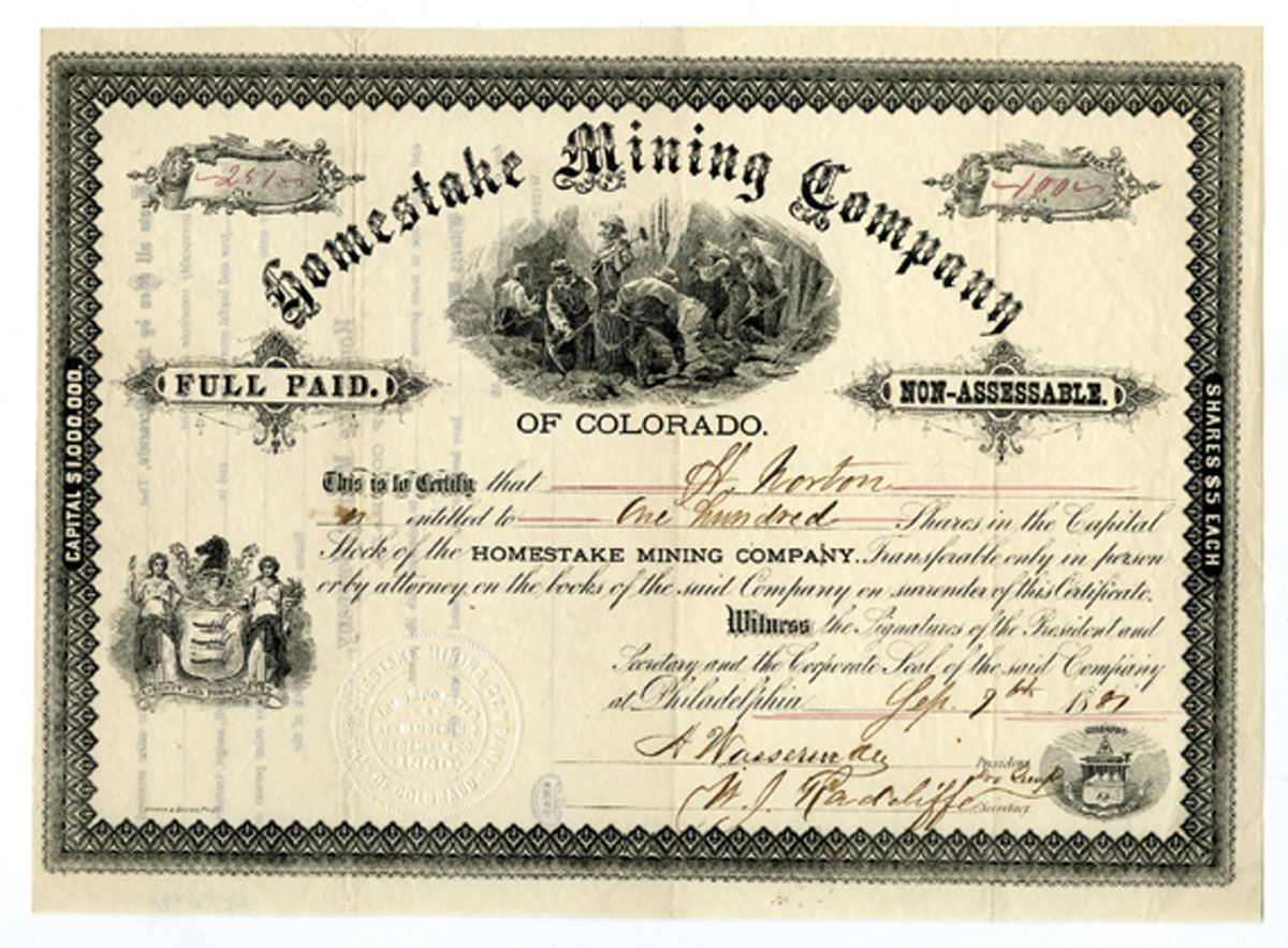 Colorado (Inc. in New Jersey with offices in Philadelphia), 1881, 100 Shares, I/U, black print with intricate border on white paper, central vignette of miners at work underground, additional vignette of allegorical maidens with shield at lower left, embossed corporate seal at lower center, issued to H. Norton and signed by company officers, the Homestake Mining Company of Colorado (distinct from the famous South Dakota operation) sought to attract capital during the regional mining rushes of the late 19th century, highlighting the speculative fervor surrounding Colorado mining ventures, VF condition with strong detail, light folds and 3 very small holes in the corporate seal area. Printed by Lehman & Bolton, Phila.