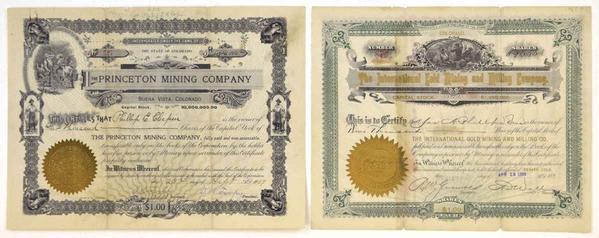 Colorado, 1896-1909. Lot of 2 I/U Stock Certificates, Includes: 1896, International Gold Mining and Milling Co., 9000 Shares Capital Stock Certificate, S/N 875; 1909, Princeton Mining Co., 2000 Shares Capital Stock Certificate, S/N 527. Condition ranges from Fine to VF with splitting at fold lines and rust stains. (2). Sold "AS IS" no returns accepted.
