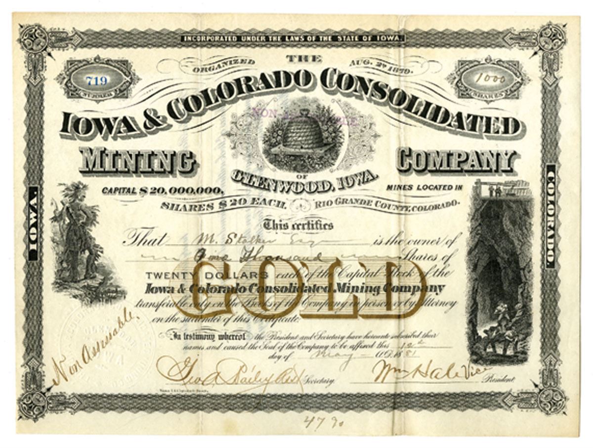 Colorado (Inc. and offices in Glenwood, Iowa), 1000 Shares I/U stock certificate, black print with ornate border, issued May 9, 1881 to M. Stoher. Bold gold overprint “GOLD” across center. Vignettes include: Native American figure with spear at left, miners working underground at right, and beehive symbolizing industry and prosperity at top center. Incorporated August 27, 1879 under Iowa law with an ambitious capitalization of $20,000,000, Mines in Rio Grande County, Colorado. The company reflects the speculative rush of Midwestern investors into Colorado’s booming mining districts. Embossed company seal lower left. A scarce and visually impressive certificate with strong design appeal. VF condition.