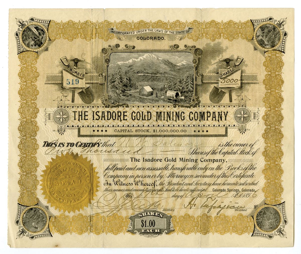 Colorado Springs, Colorado, 1896. 5000 Shares Capital Stock I/U Certificate, Black print with gold border and underprint, Mining camp at top center with different mining vignettes at each corner and gold embossed seal at bottom left, S/N 519, VF to VF+ with archival reinforcement on back.