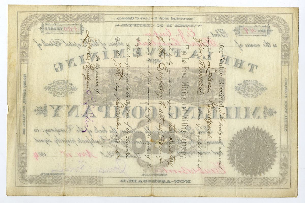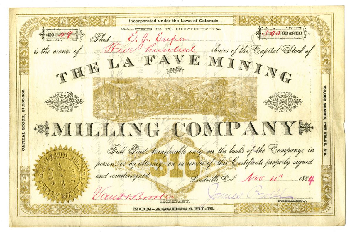 Leadville, CO (Inc. in Colorado), 500 Shares I/U stock certificate, black and gold print on white paper with ornate border, central vignette of miners at work in front of a mill with surrounding mountain landscape, embossed gold corporate seal at lower left, signed by the company president and secretary, the La Fave Mining & Milling Company was incorporated in Colorado to operate in the Leadville district during the height of the silver boom, Choice VF condition or better, Printed by Franklin Printing House, Leadville.
