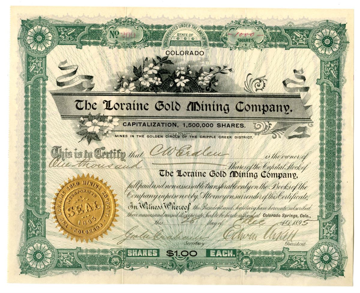 Colorado, Springs, Colorado, 1895. 1000 Shares Capital Stock I/U Certificate, Black print with green border and underprint, Company title at top center with flowers and gold embossed seal at bottom left, S/N 209, VF to XF condition.