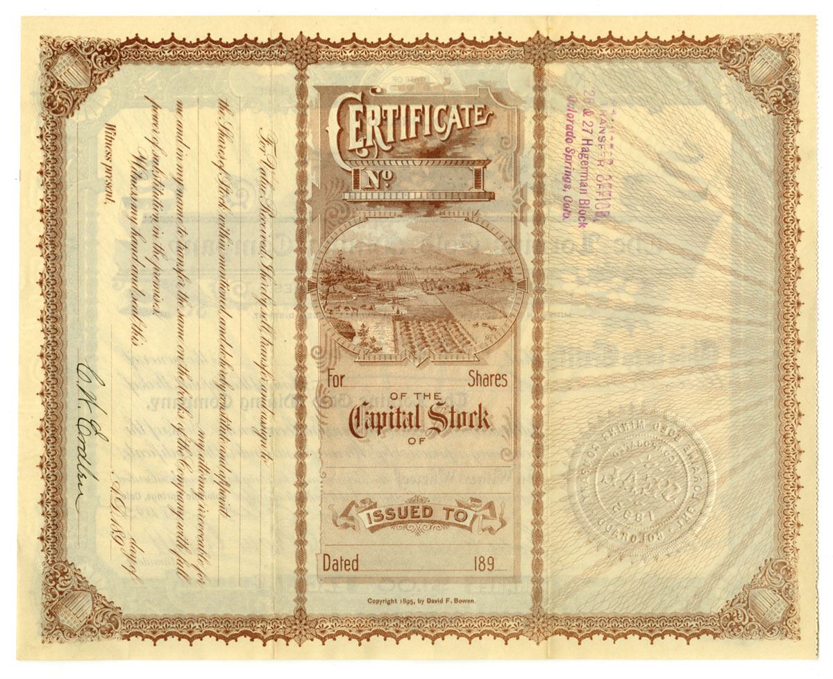 Colorado, Springs, Colorado, 1895. 1000 Shares Capital Stock I/U Certificate, Black print with green border and underprint, Company title at top center with flowers and gold embossed seal at bottom left, S/N 209, VF to XF condition.