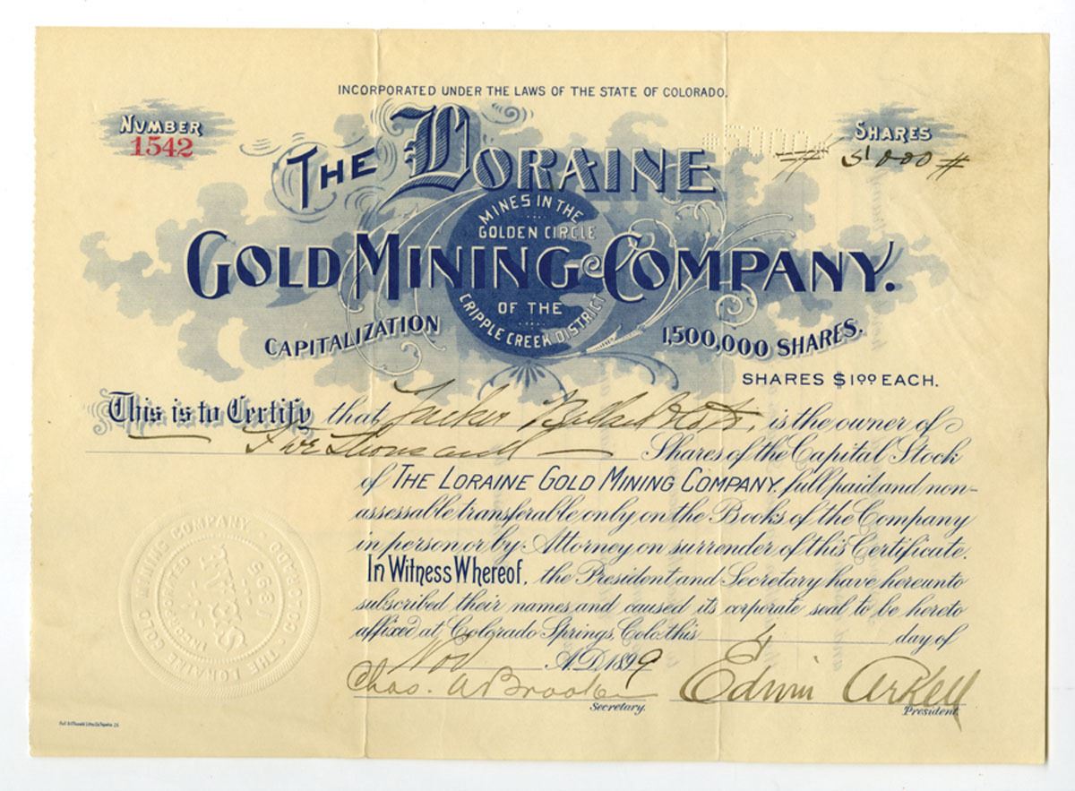 Colorado Springs, Colorado. 1899. 5000 Shares Capital Stock Certificate, Blue print with no border and title, S/N 1542, VF to XF condition. Mines located in the Golden Circle of the Cripple Creek District.