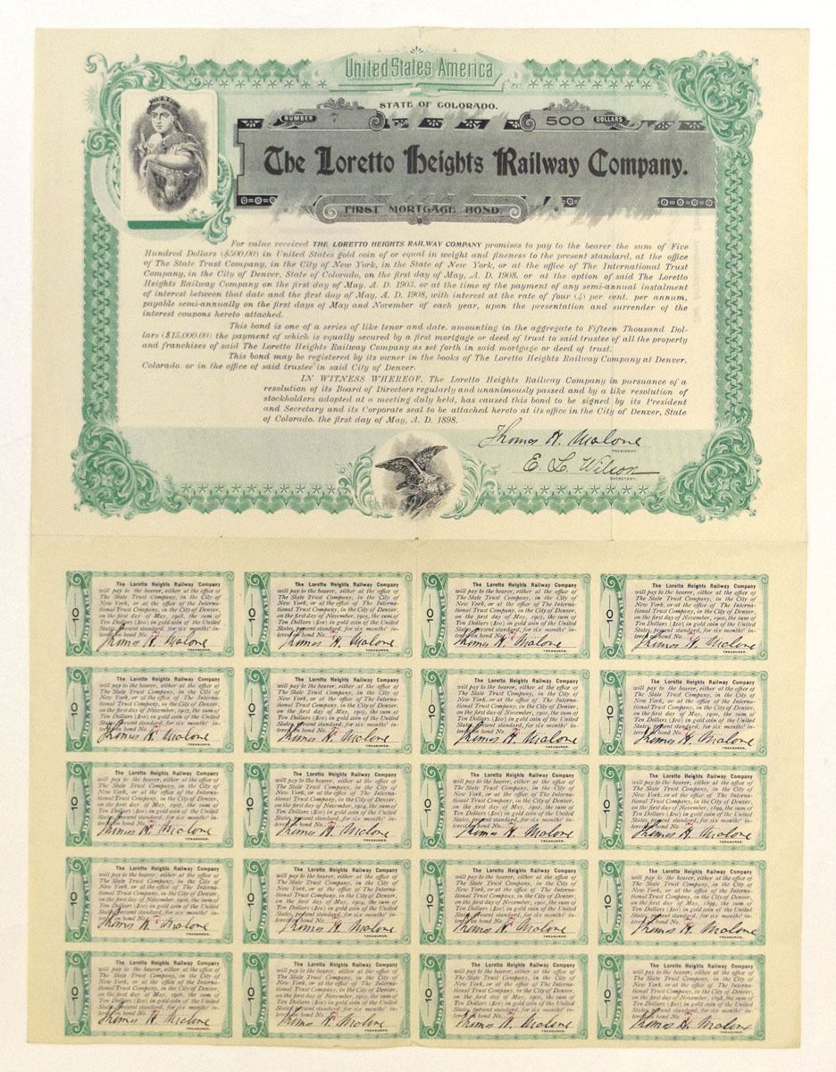 Colorado, 1898. $500 I/U 4% First Mortgage Coupon Bond, Black print with green border and underprint, grim-faced Liberty top left corner and Eagle with chicks at bottom center, horizontal format, S/N 7, XF to AU condition. Coupons attached. This is the exact certificate pictured in Cox, and very possibly unique. It is listed as unissued, but that was a mistake, The certificate has an embossed corporate seal as well as being full signed.