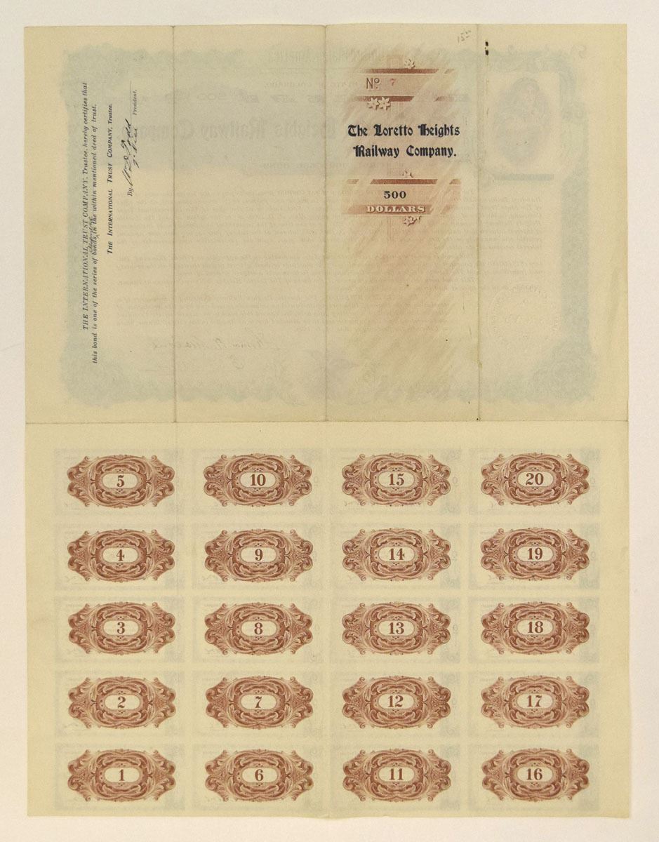 Colorado, 1898. $500 I/U 4% First Mortgage Coupon Bond, Black print with green border and underprint, grim-faced Liberty top left corner and Eagle with chicks at bottom center, horizontal format, S/N 7, XF to AU condition. Coupons attached. This is the exact certificate pictured in Cox, and very possibly unique. It is listed as unissued, but that was a mistake, The certificate has an embossed corporate seal as well as being full signed.