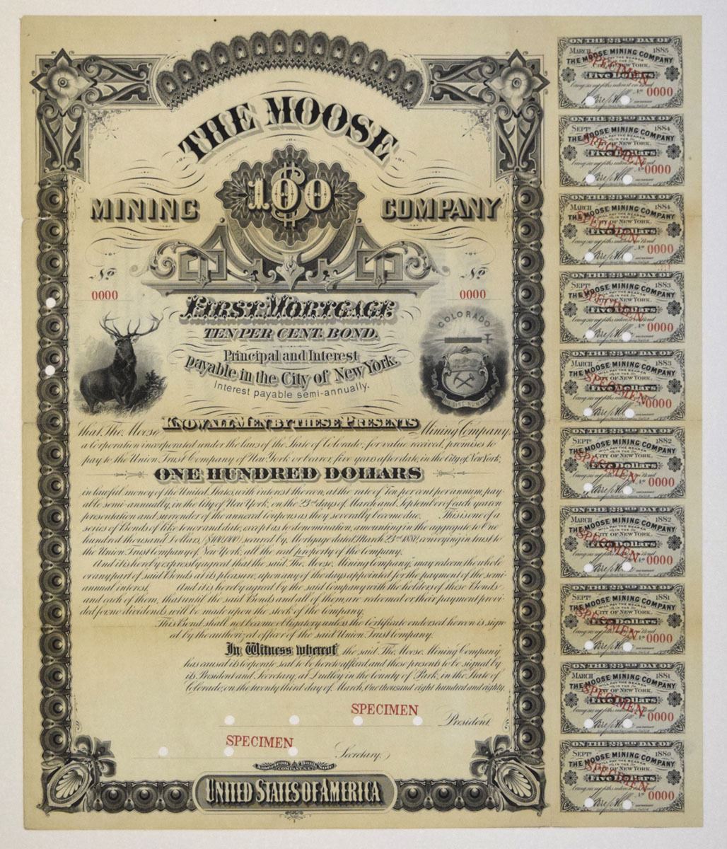 Colorado (Incorporated in NY), 1880. $100 Specimen 10% First Mortgage Coupon Bond, Black with ornate black border, Company title at top center with moose and arms of Colorado flanking, Specimen overprints and pocks, VF to XF condition with archival repairs. ABNC.