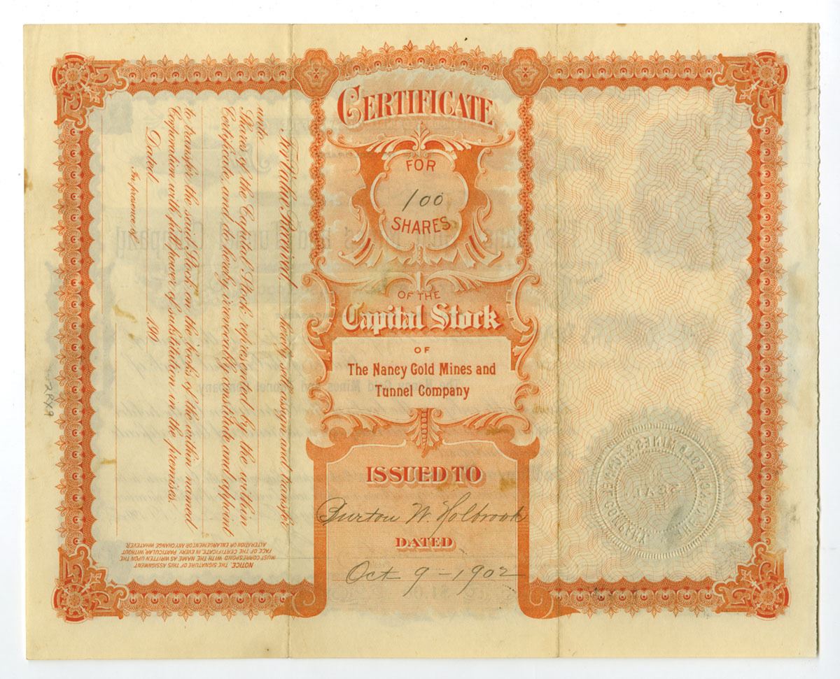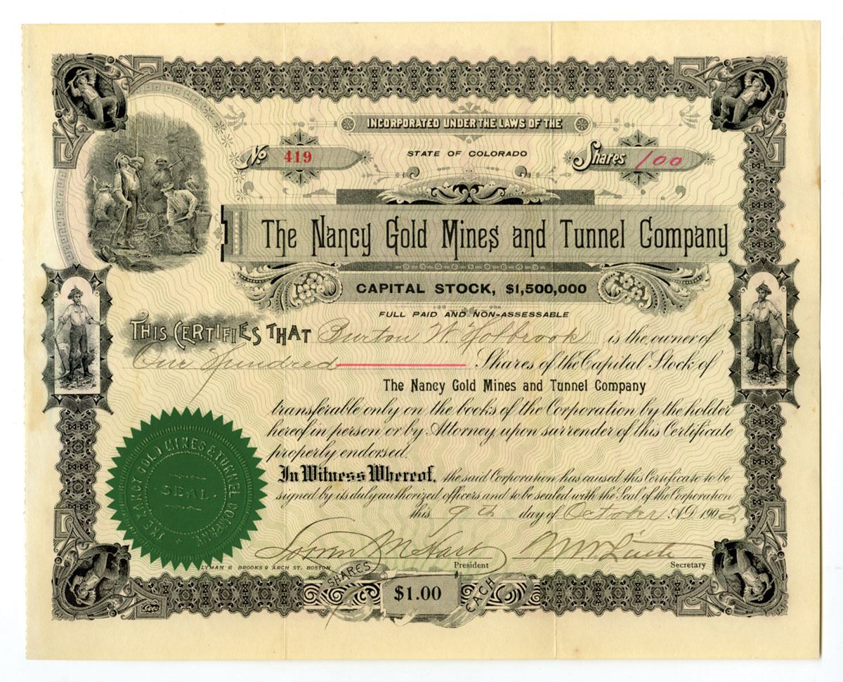 Colorado, 1902. 100 Shares Capital Stock I/U Certificate, Black print with black border, mining vignettes around border and on left of title, S/N 419, VF to XF condition.