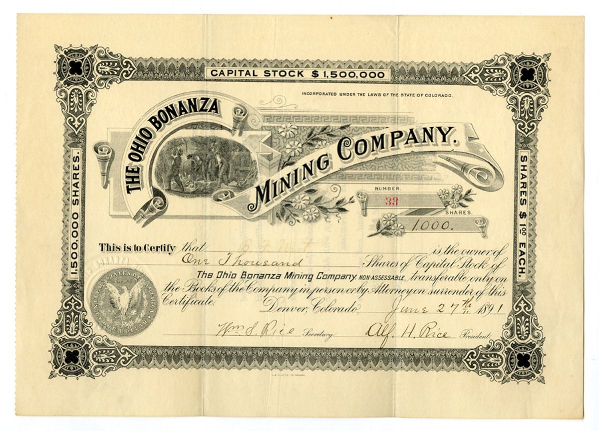 Ohio, 1891. 1000 Shares I/U Stock Certificate, Black print with black border and company name at center with mining vignette in middle left, S/N 33, VF to Choice VF condition. C & C Litho.
