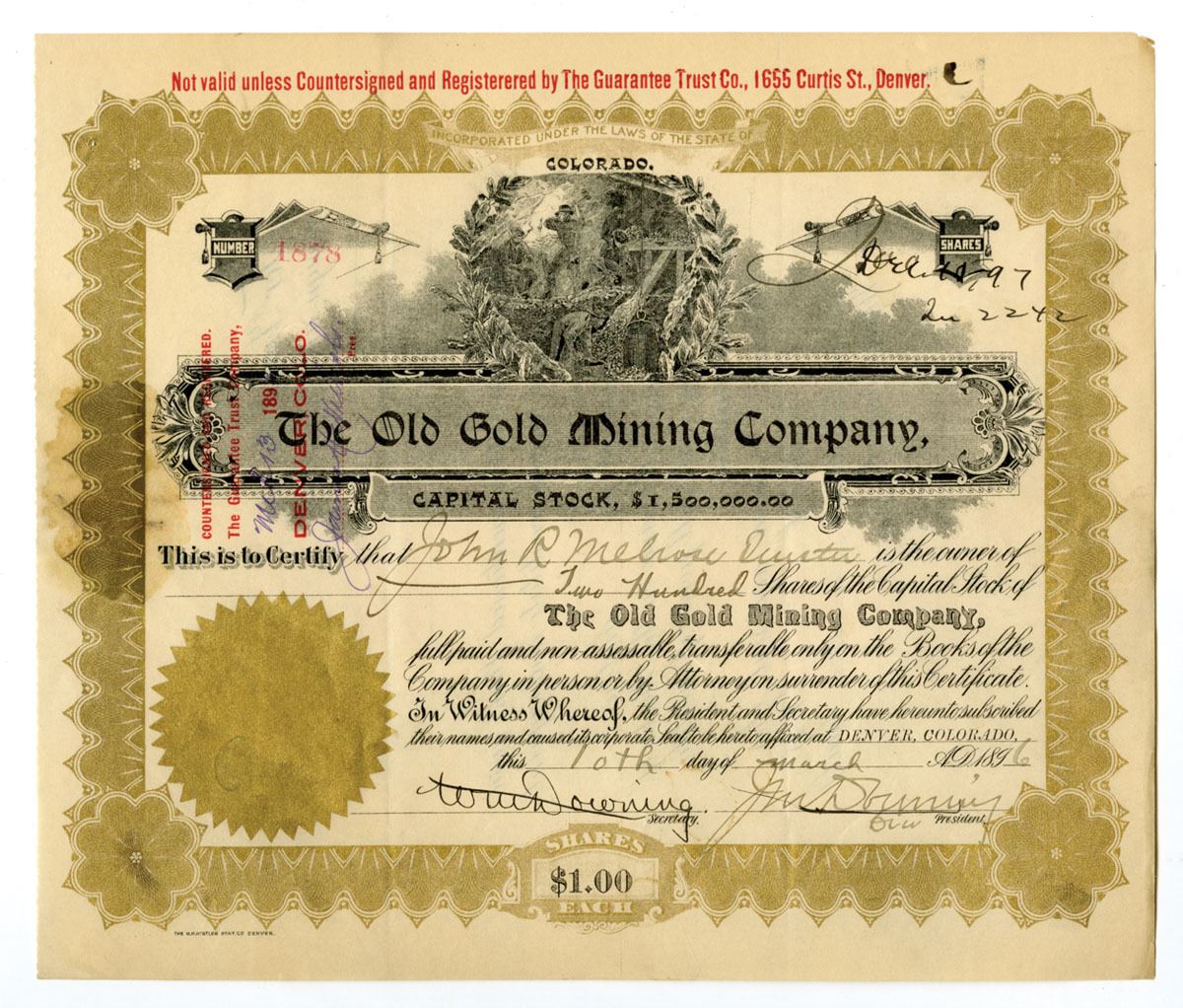 Denver, Colorado, 1896. 200 Shares Capital Stock I/U Certificate, Black print with gold border and mining vignette above title at center, S/N 1878, VF to XF condition with stain on left side.