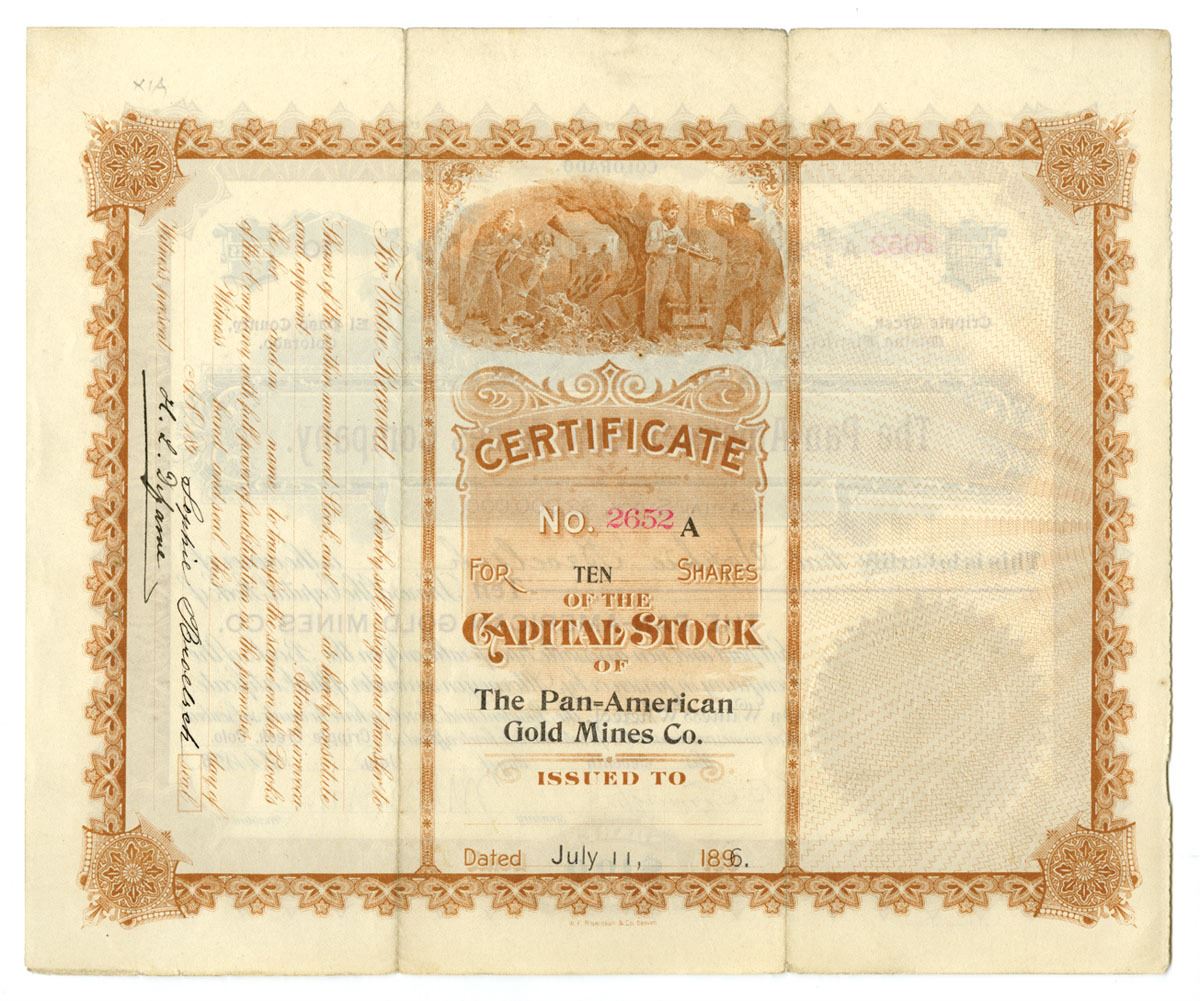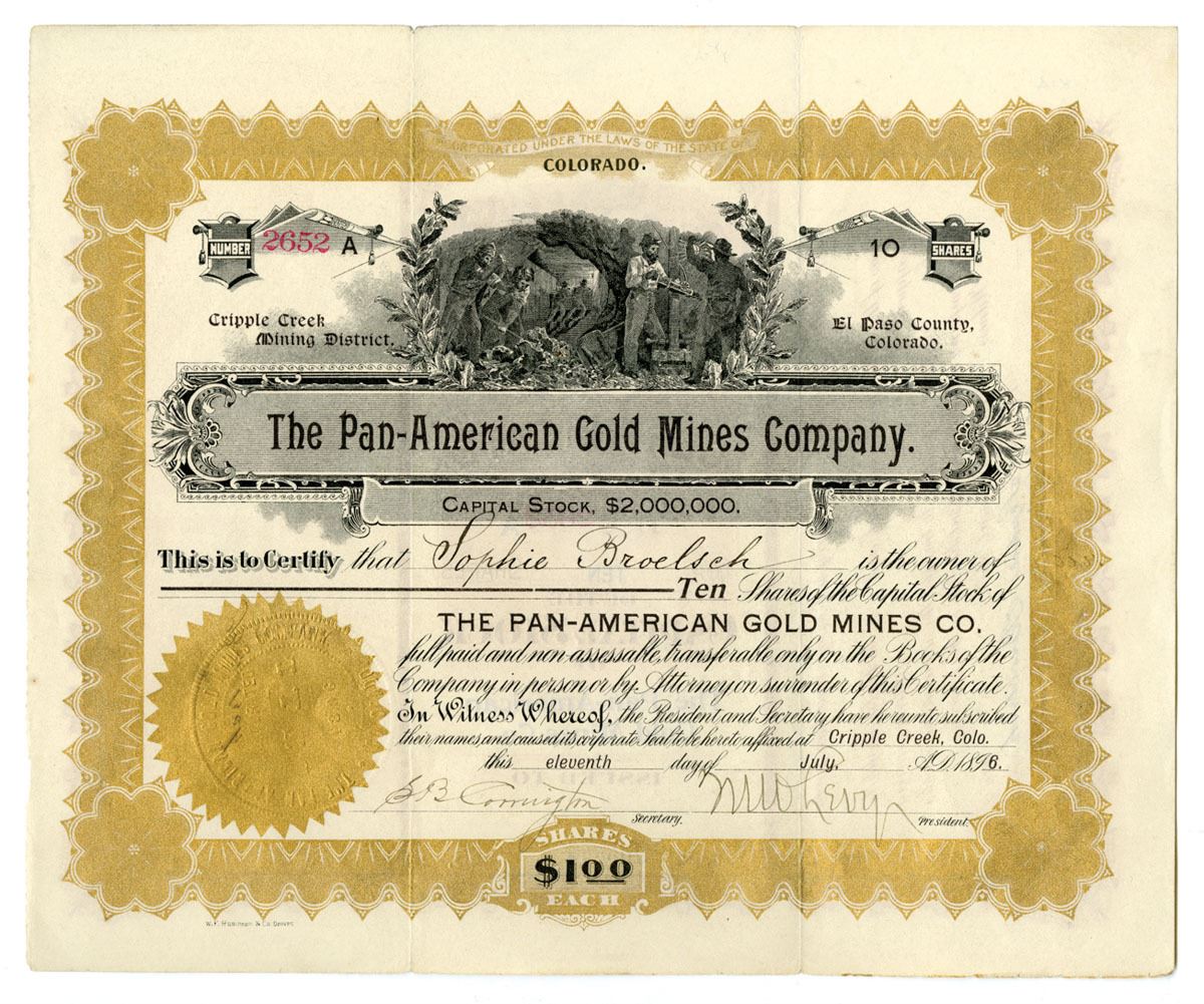 Cripple Creek, Colorado, 1896. 10 Shares Capital Stock I/U Stock Certificate, Black print with gold border and mining vignette above title at top center with gold embossed seal at bottom left, S/N 2652, Mine located in El Paso County, XF to AU condition.