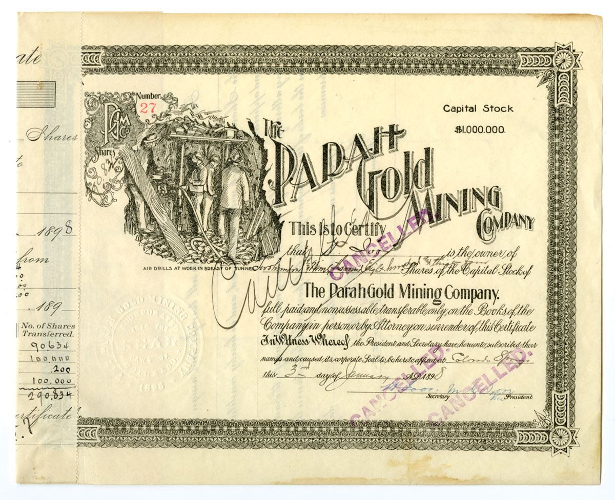 Colorado Springs, Colorado, 1898. 290,834 Shares Capital Stock I/C Certificate, Black print with black border, Mining vignette at left of title at top, S/N 27, Cancelled stamps across center, VF to VF+ condition with minor stain at bottom margin.