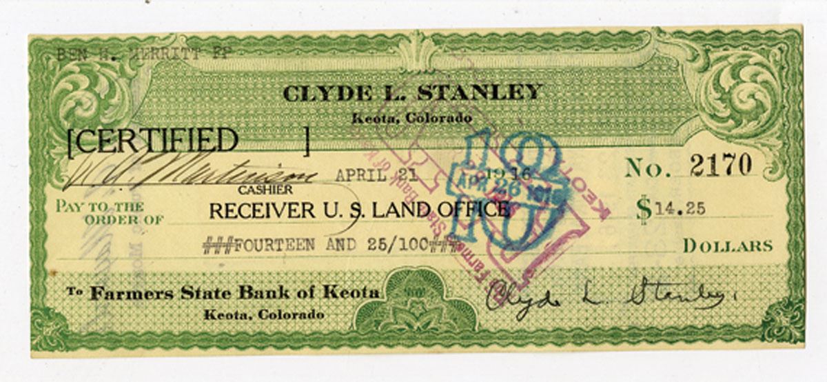 Keota, CO., 1916, $14.24, I/C Certified Check payable to Receiver U.S. Land Office, from Clyde L. Stanley, Black printing on green underprint, S/N 2170, XF-AU condition.