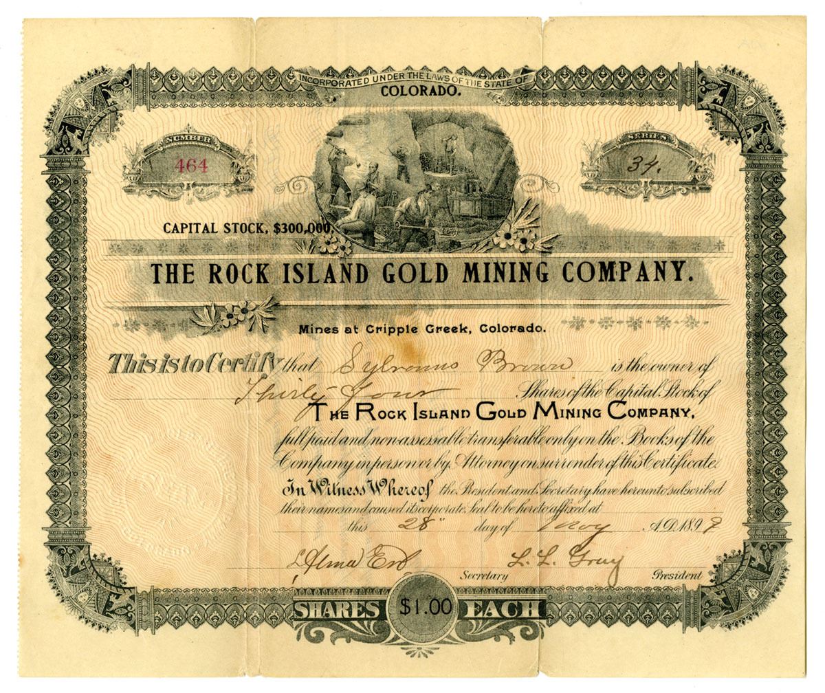 Cripple Creek, Colorado, 1899. 34 Shares Capital Stock I/U Certificate, Black print with black border and orange underprint, Mining vignette above title at top center, S/N 464, Fine condition with toning and light stains.
