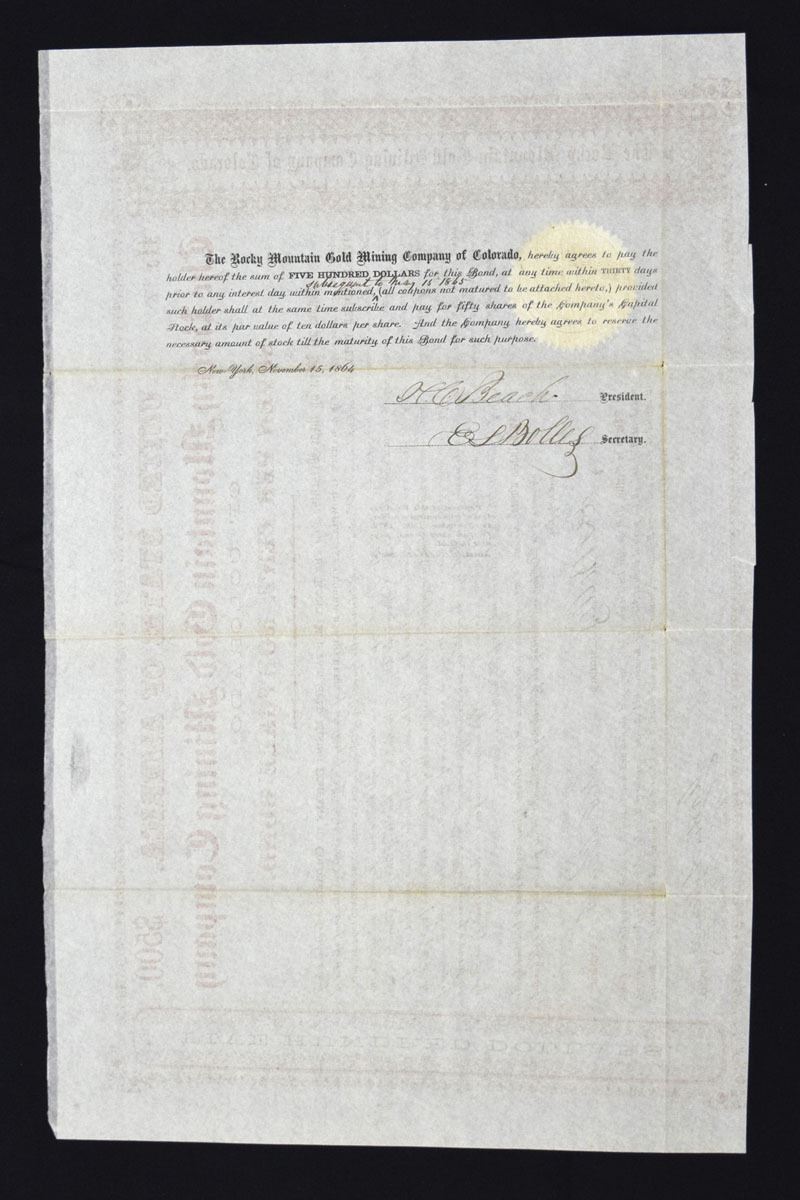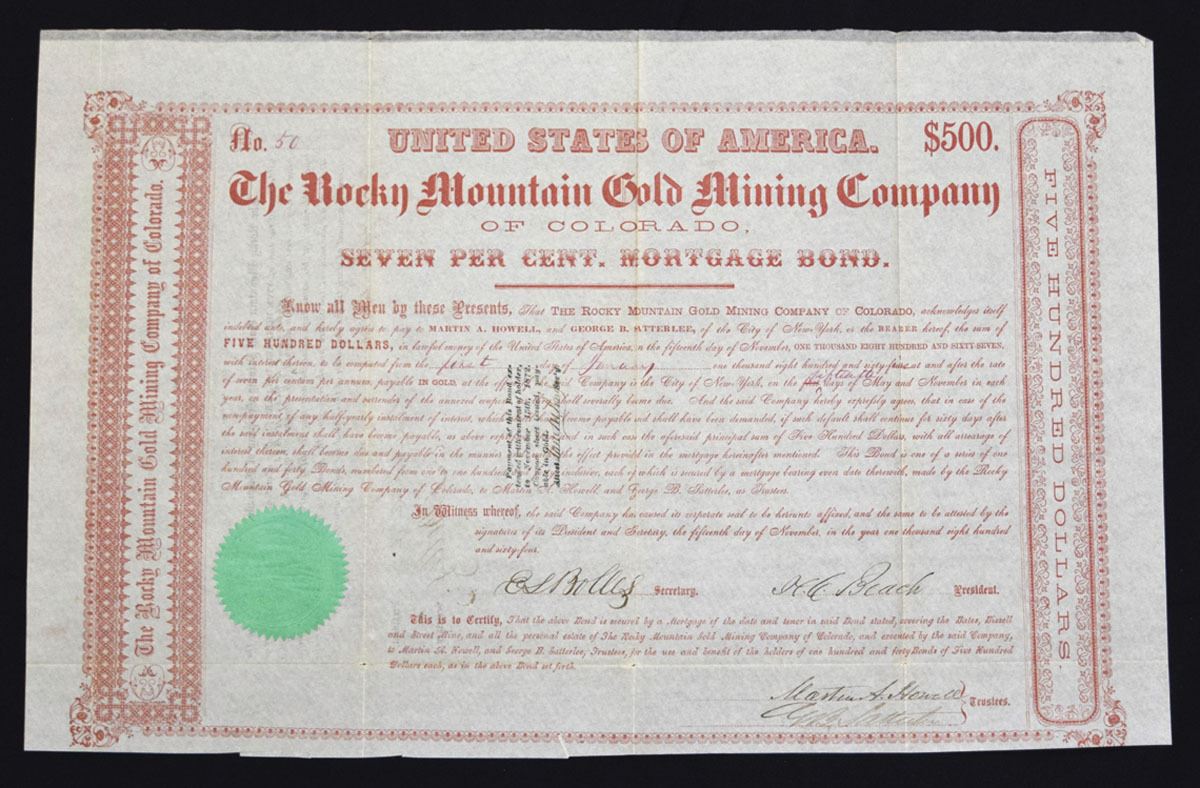 Colorado Territory, $500 I/U 7% Gold Coupon bond (all of the coupons have been redeemed, S/N 50, certificate issued by the Rocky Mountain Gold Mining Company, printed in vivid red with decorative border, large central block of detailed mortgage terms, embossed green corporate seal at lower left. The bond carried a 7% interest rate, payable semi-annually, and was part of the company’s effort to finance mining development during Colorado’s early boom years. Signed by the company’s president, secretary, and trustees. Bonds of this type reflect the mechanisms used by mining companies to attract Eastern investment capital during the post–Civil War expansion into Colorado’s mineral fields. Scarce financial relic, VF condition with folds.