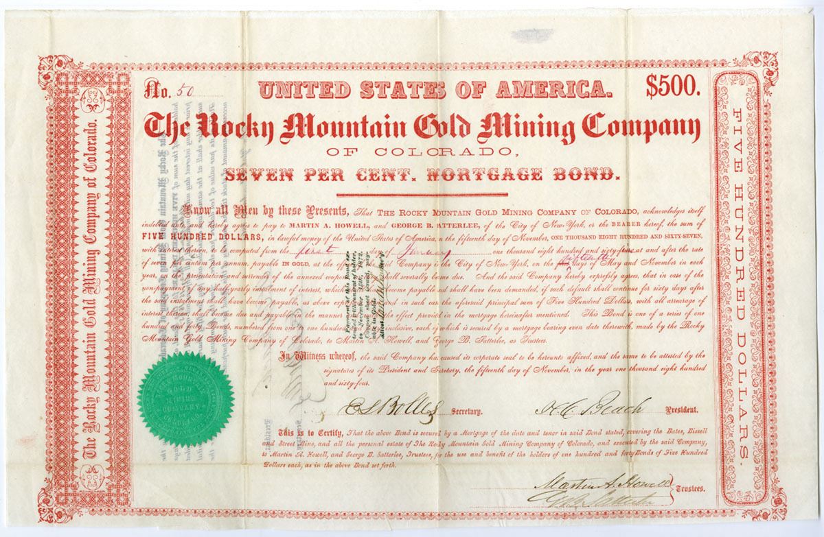 Colorado Territory, $500 I/U 7% Gold Coupon bond (all of the coupons have been redeemed, S/N 50, certificate issued by the Rocky Mountain Gold Mining Company, printed in vivid red with decorative border, large central block of detailed mortgage terms, embossed green corporate seal at lower left. The bond carried a 7% interest rate, payable semi-annually, and was part of the company’s effort to finance mining development during Colorado’s early boom years. Signed by the company’s president, secretary, and trustees. Bonds of this type reflect the mechanisms used by mining companies to attract Eastern investment capital during the post–Civil War expansion into Colorado’s mineral fields. Scarce financial relic, VF condition with folds.