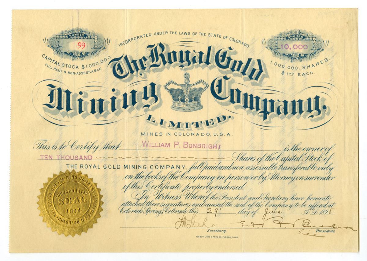 Colorado Springs, Colorado, 1898. 10,000 Shares Capital Stock I/U Certificate, Blue print without border, Company title at top center with crown vignette bellow and gold embossed seal at bottom left, S/N 99, VF to XF condition.