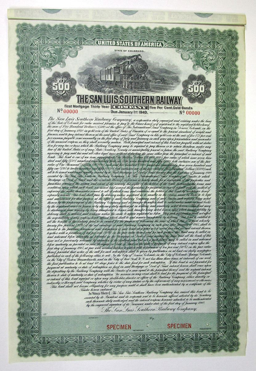 Colorado, 1910. $500 Specimen 5% First Mortgage Thirty Year Gold Coupon Bond, Black with green border and underprint, Train coming down tracks at top center, Specimen overprints and POCs, XF to AU condition, Franklin Lee BNC.