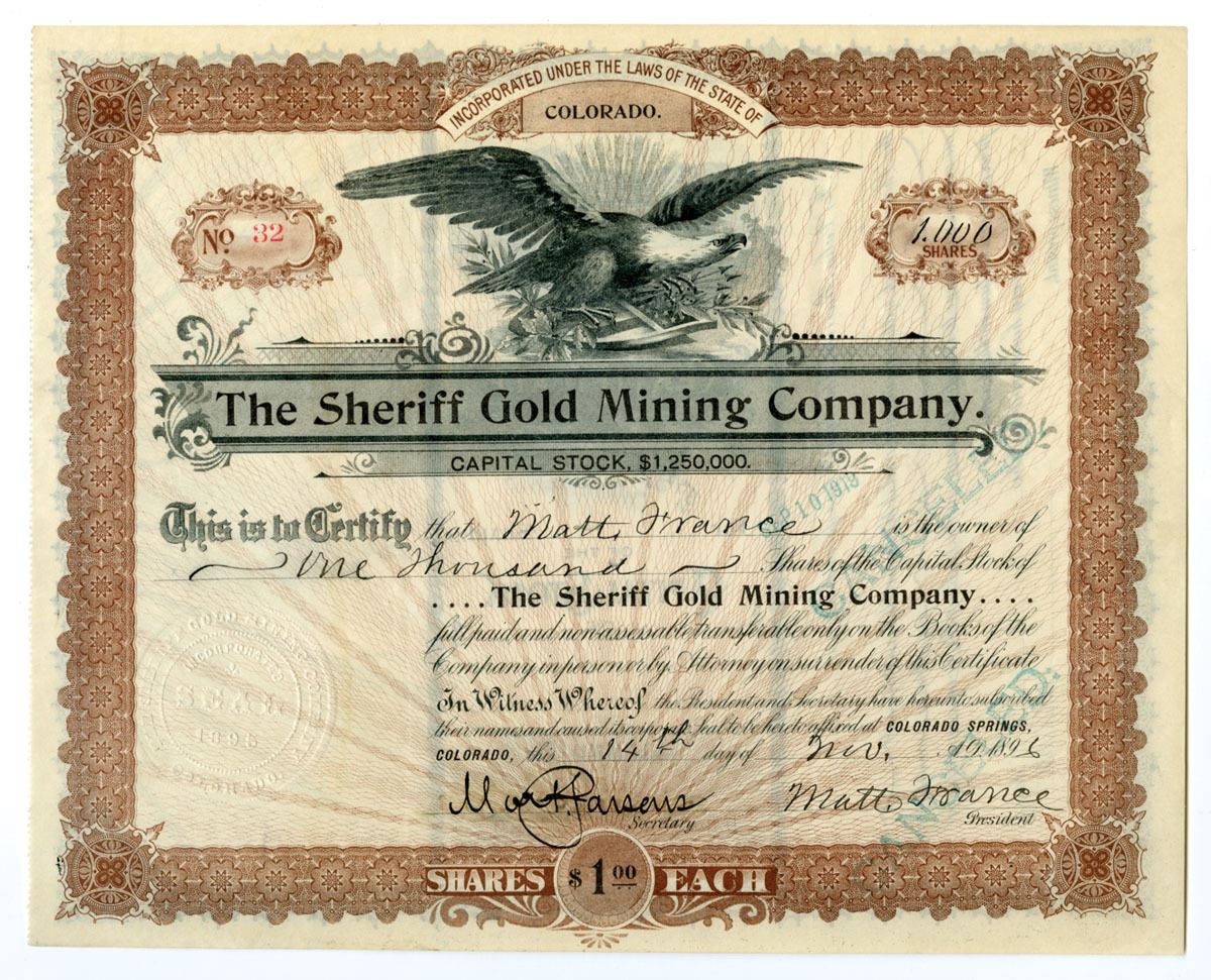 Colorado, Springs, Colorado, 1896. 1000 Shares Capital Stock I/C Certificate, Black print with brown border and underprint, Company title at top center with bald eagle perched on top, S/N 32, Cancelled stamps at bottom, VF to XF condition.