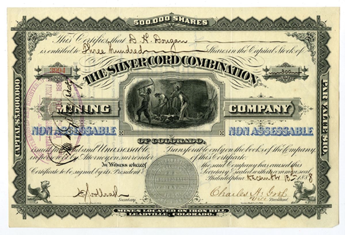 Leadville...., Colorado , 1880, 300 Shares, black print with striking blue “NON-ASSESSABLE” overprints at left and right, central vignette of miners at work underground, bold embossed company seal at lower center, purple transfer stamp at left, signed by officers, ornate border with rooster vignette in lower corners, the mines were located on Iron Hill, Leadville, CO. The Silver Cord Combination Mining Company operated during the height of the Leadville silver rush, reflecting both the promise and volatility of Colorado mining investments in the late 19th century, XF condition. ABNC.