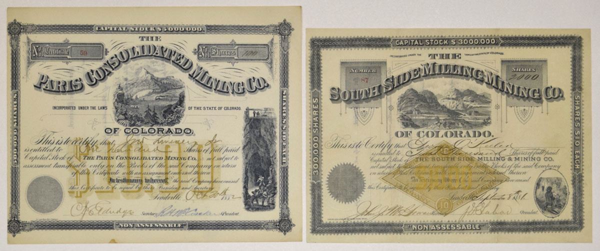 Leadville, Colorado..., 1881-82. Lot of 2, I/U Stock Certificates, Includes: 1881, South Side Milling and Mining CO. of Colorado, 2000 Shares Capital Stock Certificate; and, 1882, Paris Consolidated Mining Co., 100 Shares Capital Stock Certificate. Both have multiple vignettes, VF to XF condition. (2).