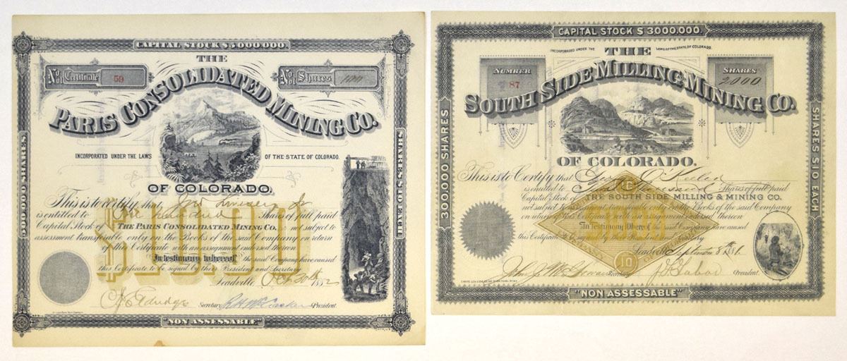 Leadville, Colorado..., 1881-82. Lot of 2, I/U Stock Certificates, Includes: 1881, South Side Milling and Mining CO. of Colorado, 2000 Shares Capital Stock Certificate; and, 1882, Paris Consolidated Mining Co., 100 Shares Capital Stock Certificate. Both have multiple vignettes, VF to XF condition. (2).