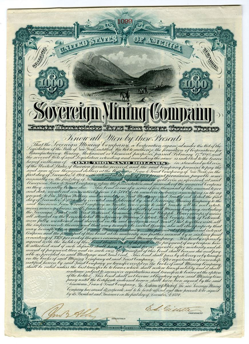 Colorado. (Office and Inc. in New York), 1884. $1000 I/U 5% First Mortgage Gold Coupon Bond, Black print with green border , miners with burros walking through a valley with mountains in the background over title, S/N 1099, VF to XF condition. The property included Sovereign, Quartzville, First National, Cummins, Placer and Whipple Placer group of mines located in the Consolidated Montgomery Mining District, Park County, Colorado. Attractive and rarely seen Colorado mining bond. Franklin BNC.