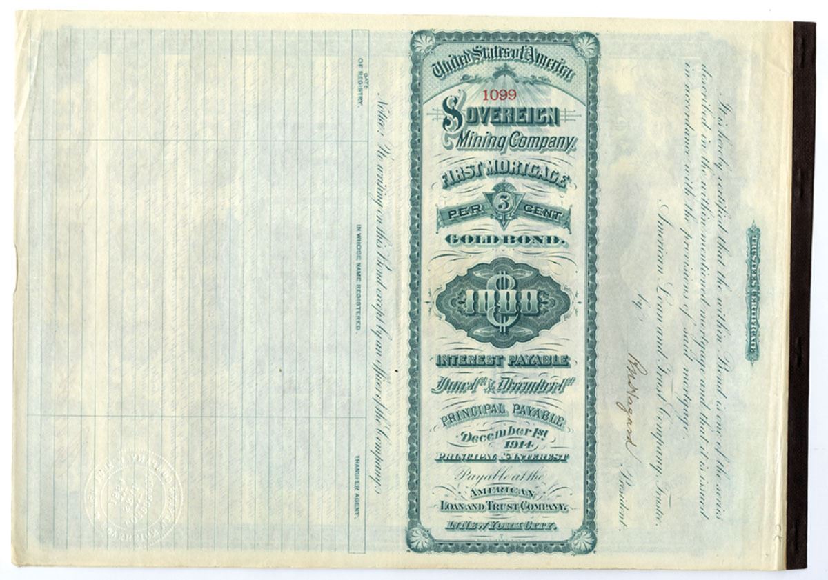 Colorado. (Office and Inc. in New York), 1884. $1000 I/U 5% First Mortgage Gold Coupon Bond, Black print with green border , miners with burros walking through a valley with mountains in the background over title, S/N 1099, VF to XF condition. The property included Sovereign, Quartzville, First National, Cummins, Placer and Whipple Placer group of mines located in the Consolidated Montgomery Mining District, Park County, Colorado. Attractive and rarely seen Colorado mining bond. Franklin BNC.