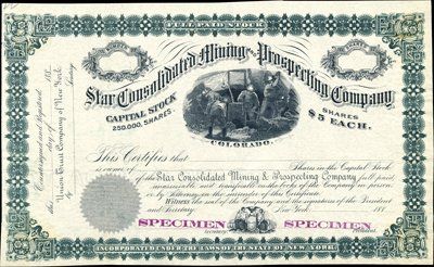 188-. Odd Shs. Specimen stock certificate from a Hamilton BNC salesman's Sample book. Green border. Miners working in mine vignette. Very light glue stains barely show on the upper right corner, otherwise looks VF. Purple "Specimen" overprints. Rare Colorado mining stock. HBNC.