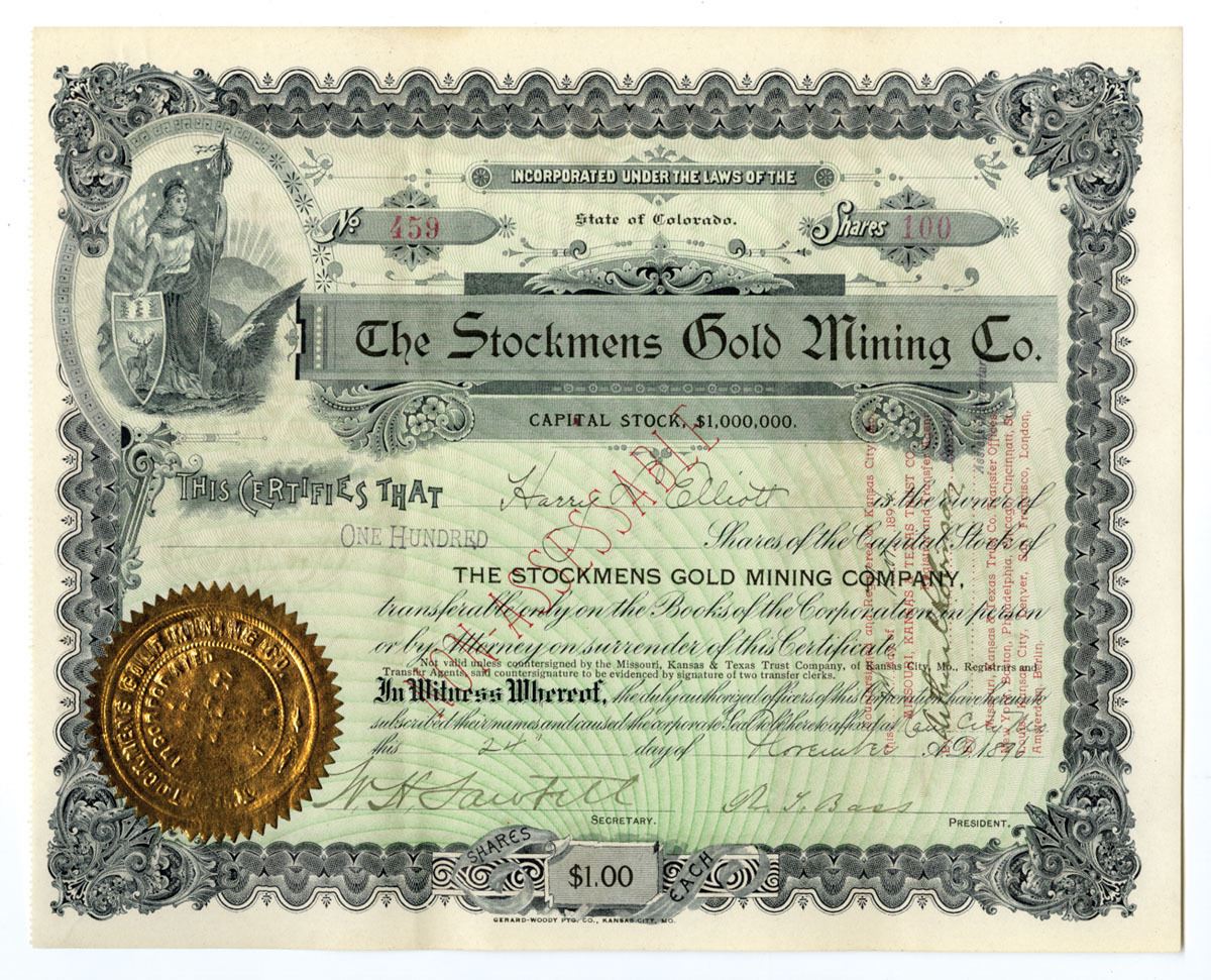 Denver, Colorado, 1896. 100 Shares Capital Stock I/U Certificates, Black print with Black border and green underprint, Vignette of woman with flag and shield on top left of certificate, S/N 459, VF to XF condition.