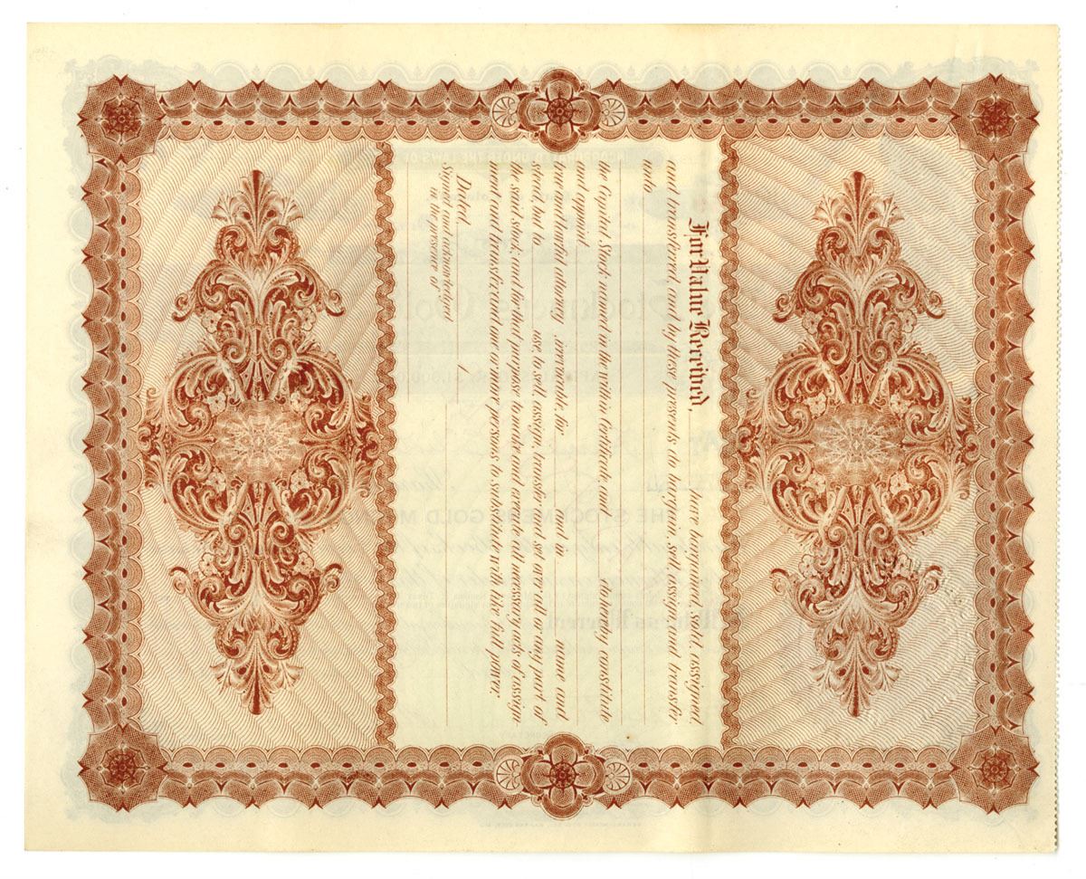 Denver, Colorado, 1896. 100 Shares Capital Stock I/U Certificates, Black print with Black border and green underprint, Vignette of woman with flag and shield on top left of certificate, S/N 459, VF to XF condition.