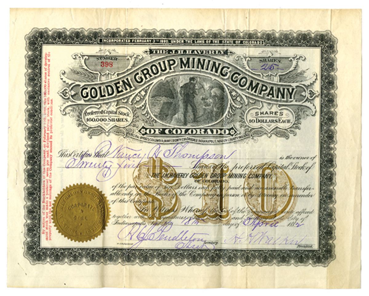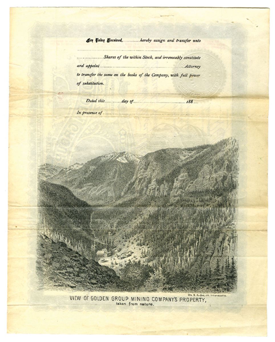 Colorado (Offices in Ouray, CO), 1882. 25 Shares, I/U Capital Stock Certificate, Black print with black border and gold underprint, Mining scene under decorative title at center, back with large view of the mining area, S/N 398, VF+ condition. Wm B. Burford Lith.