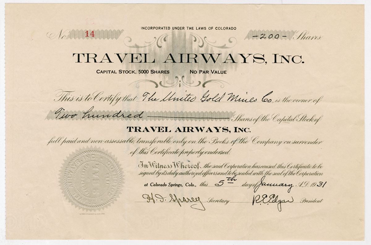 Colorado Springs, CO. 1931, I/U, 200 Shares, Stock Certificate, Black on light grey undertint, S/N 14, XF. Scarce aviation certificate.