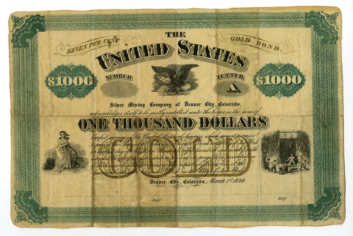 Denver City, Colorado Territory...., 1870. $1000 U/U 7% Gold Bond, Black print with green border and gold/bronze underprint, Bald Eagle at center under title with woman at left and mining scene at right, Certificate is in Good to Fine condition. Issued in Denver City during the Colorado Territorial period, this rare $1,000 gold bond represents one of the earliest forms of mining finance in the region. High-denomination gold-interest bonds were seldom issued by mining companies, making this an uncommon survivor from 1870. Although the Silver Mining Company of Denver City does not appear as a major producer, the bond reflects the ambitious capital-raising efforts of early territorial mining ventures and stands as a scarce example of pre-statehood Colorado financial history.