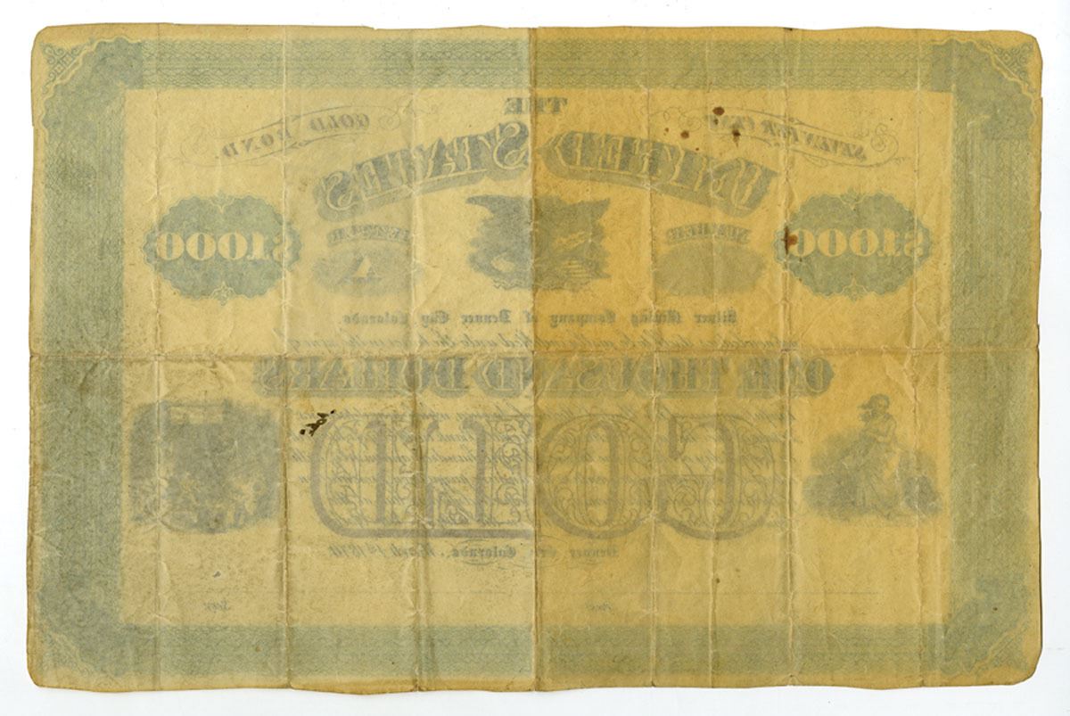 Denver City, Colorado Territory...., 1870. $1000 U/U 7% Gold Bond, Black print with green border and gold/bronze underprint, Bald Eagle at center under title with woman at left and mining scene at right, Certificate is in Good to Fine condition. Issued in Denver City during the Colorado Territorial period, this rare $1,000 gold bond represents one of the earliest forms of mining finance in the region. High-denomination gold-interest bonds were seldom issued by mining companies, making this an uncommon survivor from 1870. Although the Silver Mining Company of Denver City does not appear as a major producer, the bond reflects the ambitious capital-raising efforts of early territorial mining ventures and stands as a scarce example of pre-statehood Colorado financial history.
