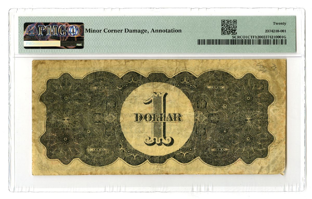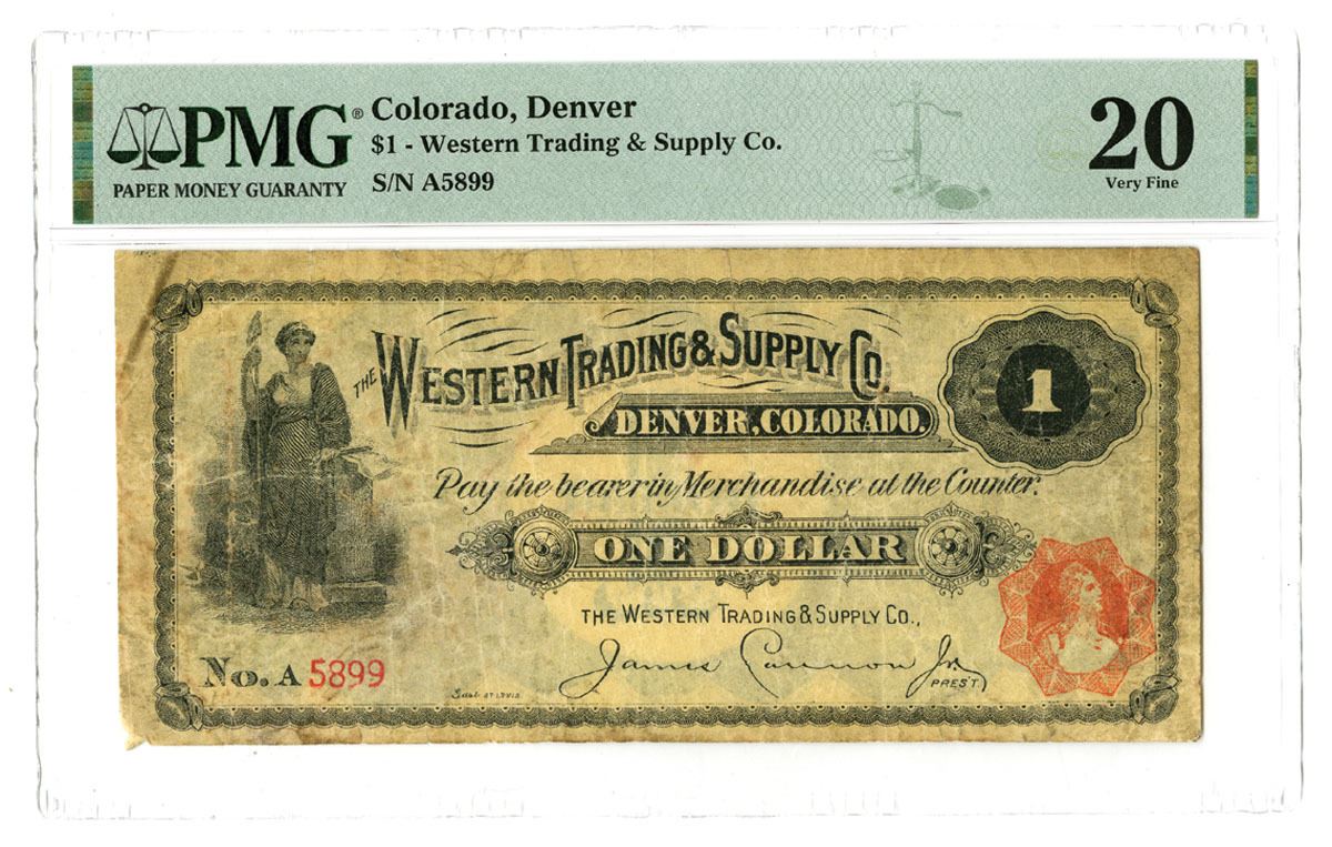 Denver, Colorado, ND (1920s). $1 Issued Banknote, Black printing with allegorical woman at left and red seal at bottom right corner, Back is dark blue with denomination at center, S/N A5899, PMG graded Very Fine 20 with comments "Minor Corner Damage, Annotation."